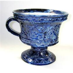 A scratch decorated blue mug, the flared bowl with foliage on the exterior and left white on the in.