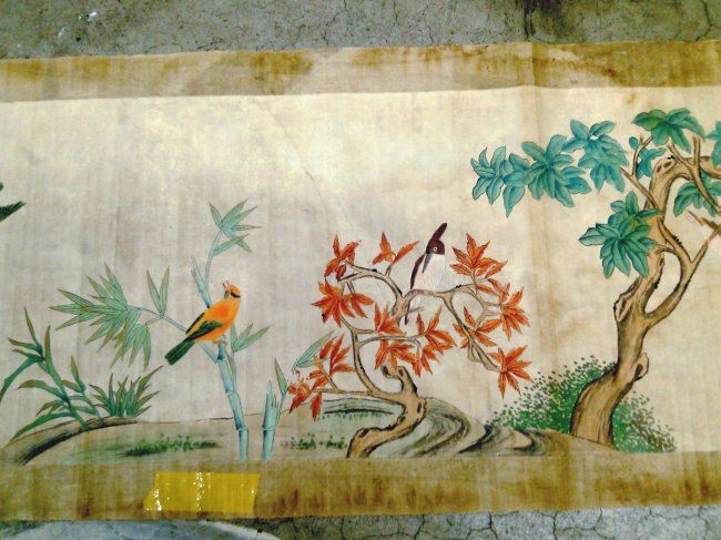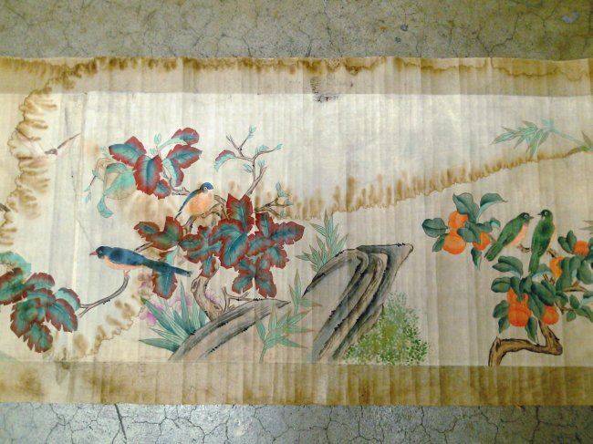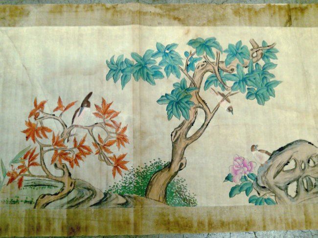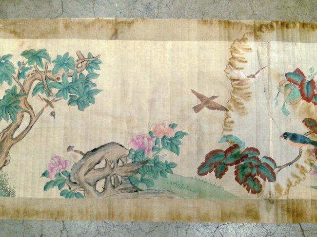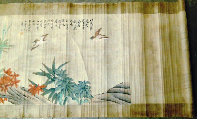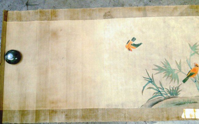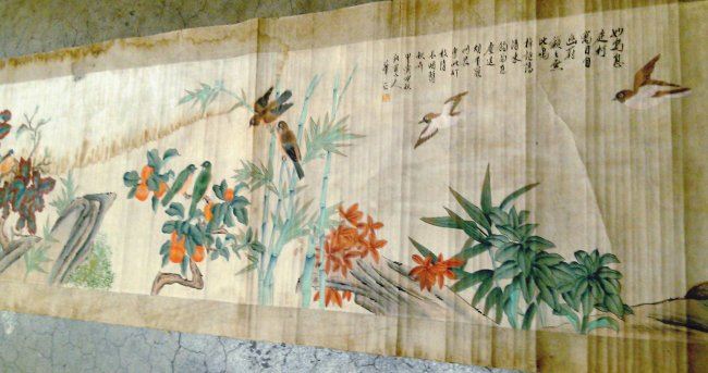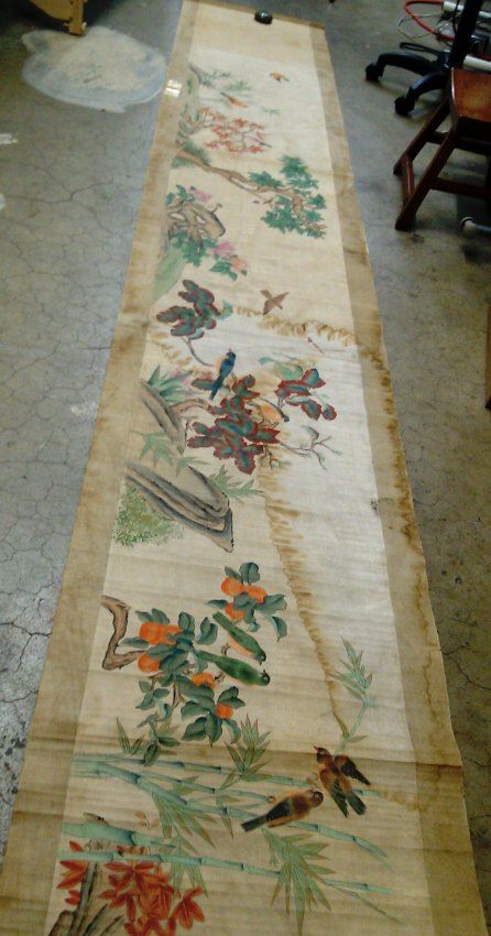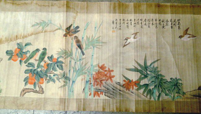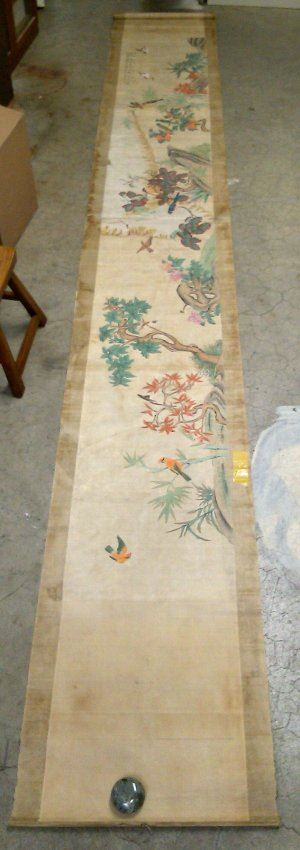 A scroll painting with pairs of birds on peach, bamboo and various other trees and peony flowers. Poem and seal mark. 14 Ft L x 23" W