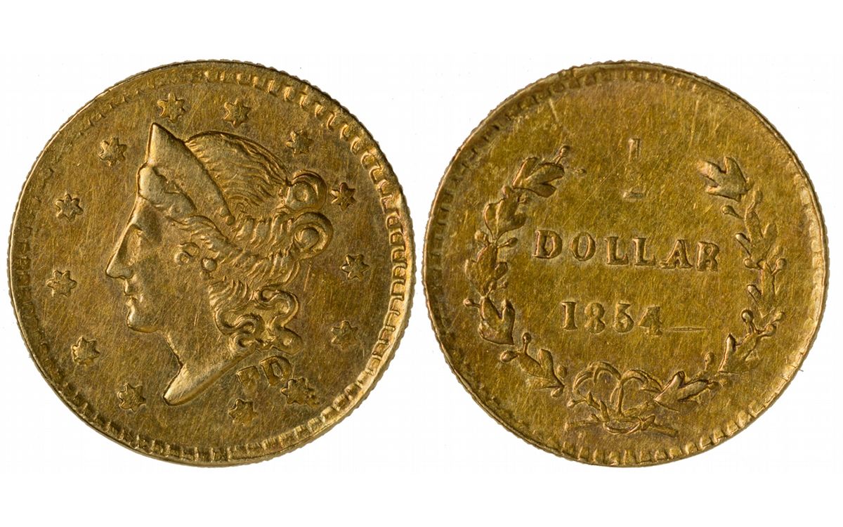 1854 Light patches of reddish toning on reverse, light bluish highlights around lettering and wreath, very minor scratch on reverse near denticles at 11:00. PCGS AU55. Ex Bowers and Merena Norweb 10/13/1987, Lot 1028, ex Norweb Collection. This coin must have been a special piece to both Norweb and Totheroh. Clearly circulated, it shows the normal circulation wear patterns. Much debate took place for years whether these coins circulated, and this coin is proof of that. Serial# 26703337 Totheroh Collection HKA#63552