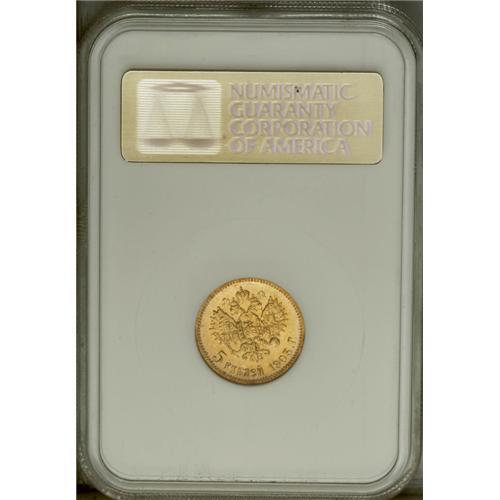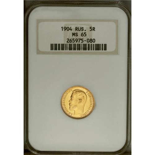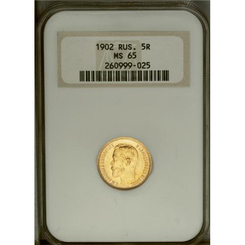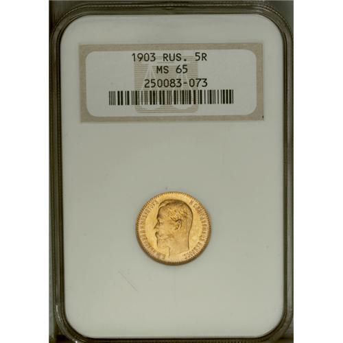 <B>A second gold 5 Rouble trio including:</B></I> 1902 AP, MS65 NGC; 1903 AP, MS65 NGC; and a 1904, MS65 NGC. All are F-180.<BR><BR><b>Shipping:</b> Coin/Currency (<a target="_blank" href="http://www.heritageauctions.com/common/shipping.php">view shipping information</a>)