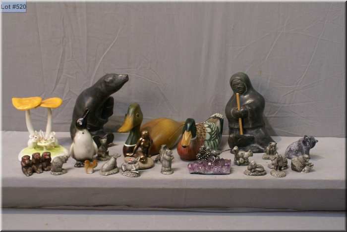 A selection of Jane Luger "The Woodland Animals" pewter miniatures, two carved wooden ducks, soapstone style figures, etc.