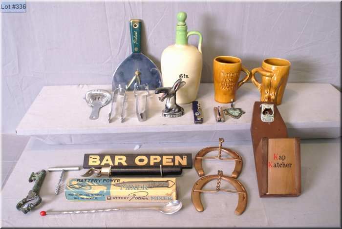 A selection of bar collectibles including stoneware gin bottle, putty knife clock, corkscrews, horse shoes, bottle openers, Jack ass mugs etc.