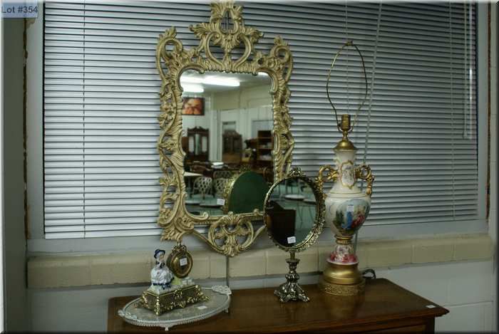 A selection of collectible including lovestory style table lamp, figural clock, ornate dresser mirror and tray and a large ornately framed wall mirror