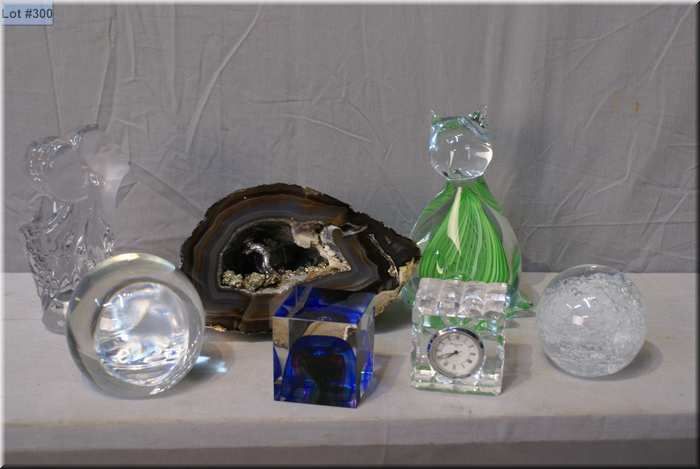 A selection of collectibles including amethyst geode, glass paperweights, etc