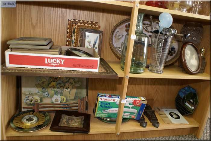 A selection of collectibles including graduated pitcher and bar utensils, interesting bottles and frame prints, pressed butterfly tray etc.