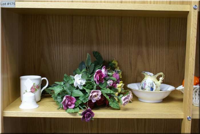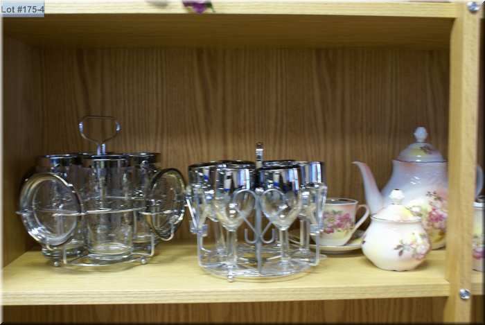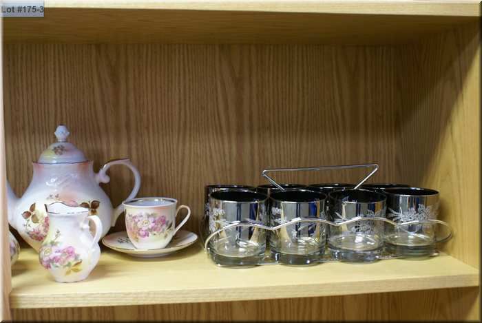 A selection of collectibles including two pinwheel crystal vases, a selection of china roses, Radnar floral, tea set including two cups and saucers plus cream and sugar, boxed mini tea set, wine glasses, hi-ball and tumblers in chrome holders etc.