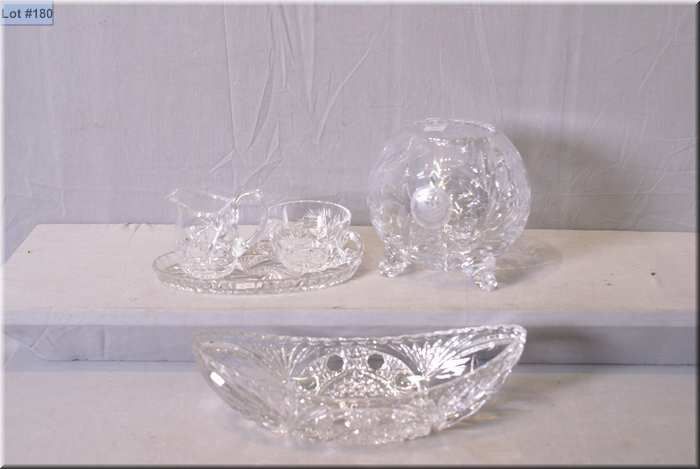A selection of crystal including a footed rose bowl, celery bowl, plus a cream and sugar with tray