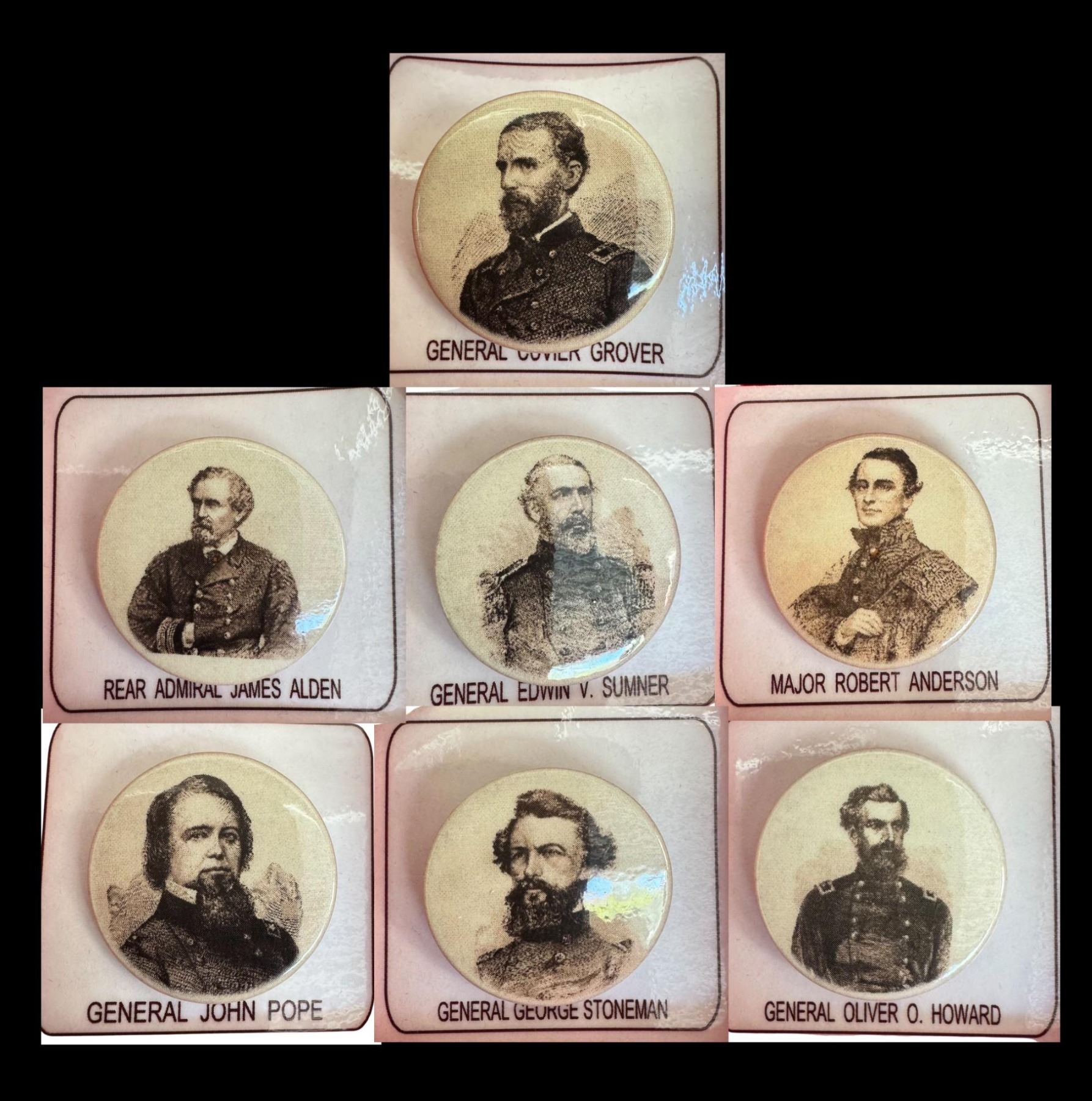 7 Large 20th C. Tight Top examples of different Civil War Generals. This is one of 5 lots of 7 buttons depicting in photographic form, a different General, who served in the Civil War. These came from the collection of Jose Roman and they are very authentic looking and in fine condition. The backs are black lacquered backs with loop shanks, each is placed on a laminated card with the Generals name on it. NOTE: These are BUTTONS and not pin backs so collectors should love these.