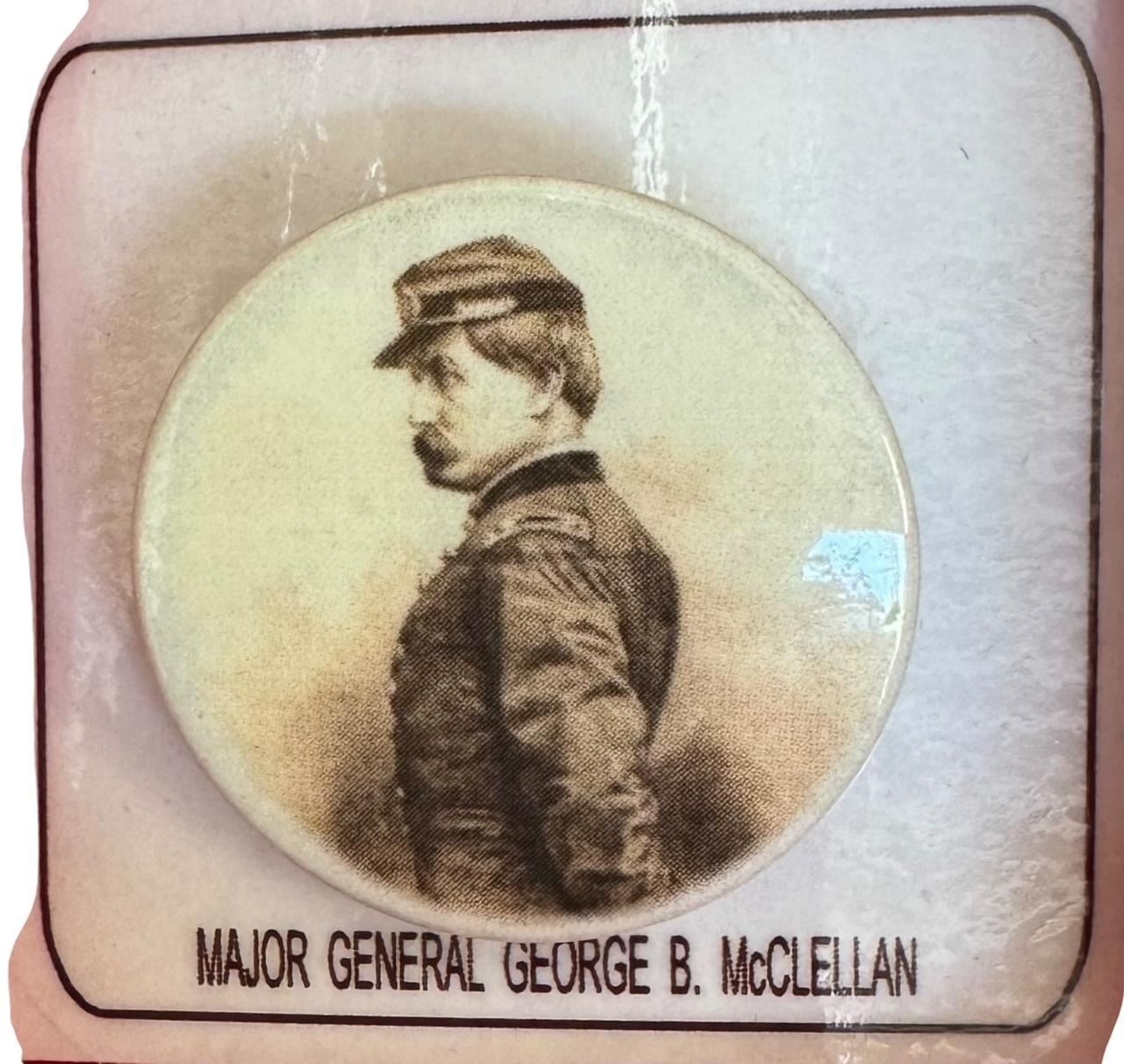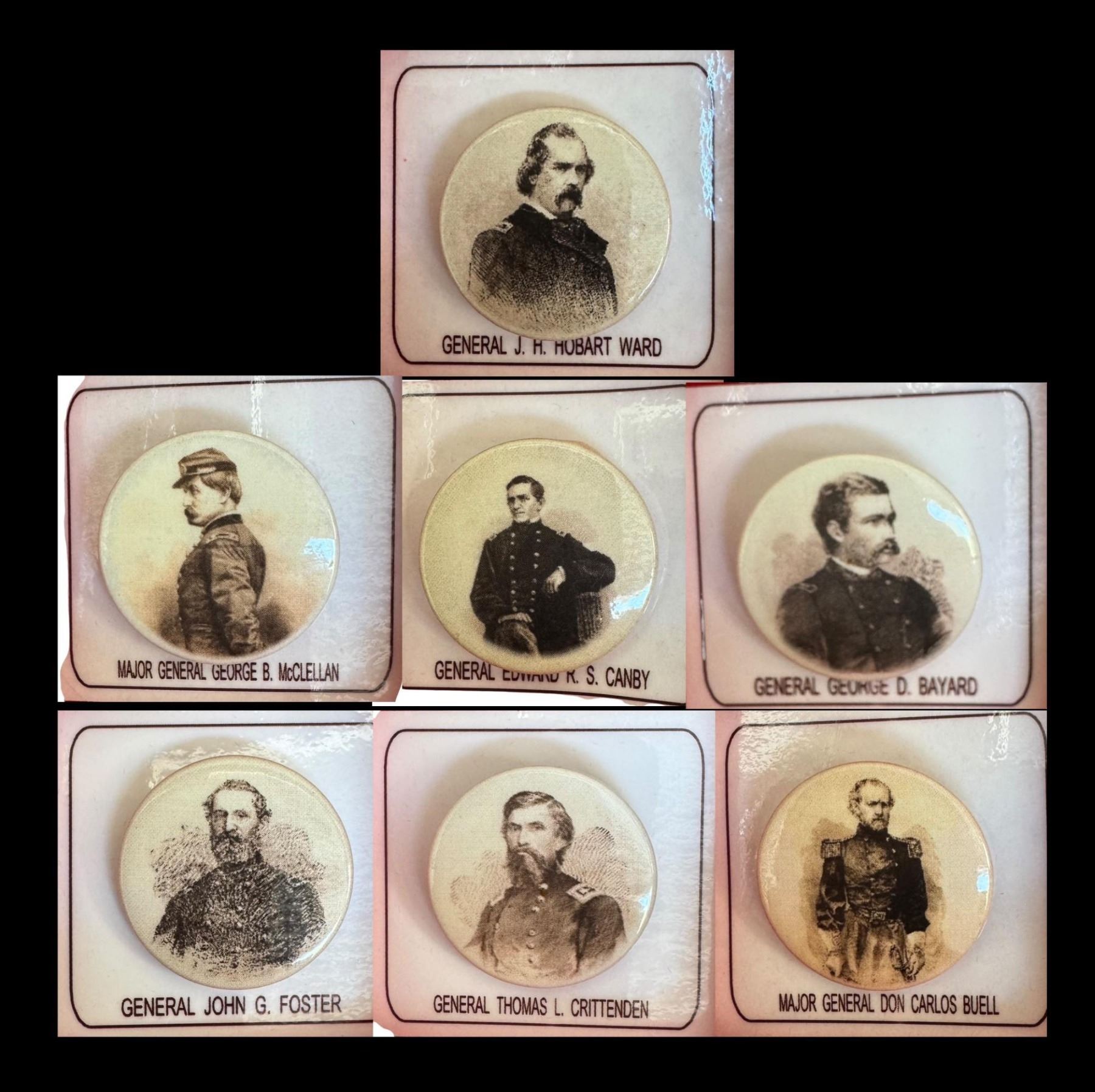 7 Large 20th C. Tight Top examples of different Civil War Generals. This is one of 5 lots of 7 buttons depicting in photographic form, a different General, who served in the Civil War. These came from the collection of Jose Roman and they are very authentic looking and in fine condition. The backs are black lacquered backs with loop shanks, each is placed on a laminated card with the Generals name on it. NOTE: These are BUTTONS and not pin backs so collectors should love these.