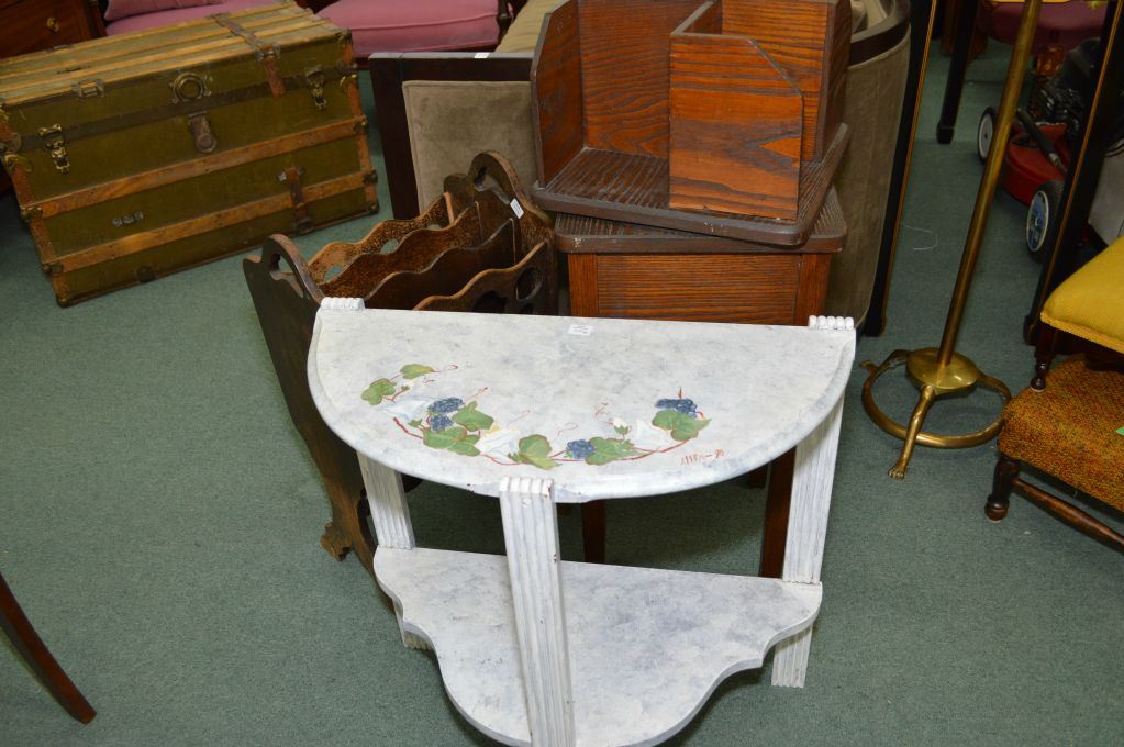 A selection of furniture including a hand made oak occasional table with media/book storage, painted flat to the wall table and a magazine storage rack