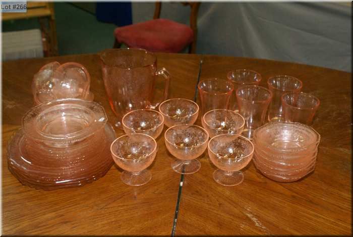 A selection of pink Depression glass style glassware including lemonade set with pitcher and five glasses, parfait cups, plates, cups and saucer, fruit nappies and lunch plates etc.