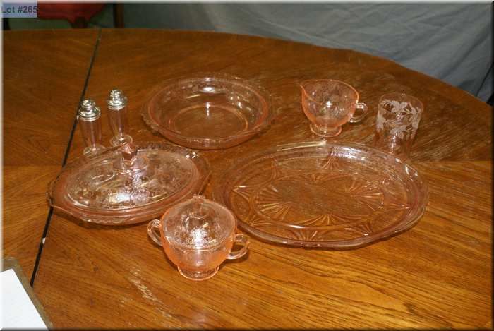 A selection of pink Depression style glassware including serving dishes, lidded casserole, cream and lidded sugar salt and pepper etc.