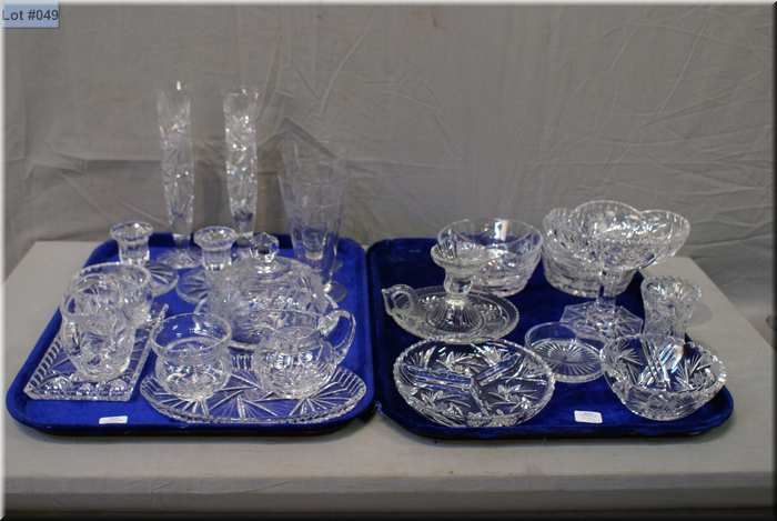 A selection of vintage crystal and glassware including lidded pinwheel butter dish and two sets of cream and sugars with trays, candlesticks, bud vases, parfait glasses, berry bowls, comport, etc.