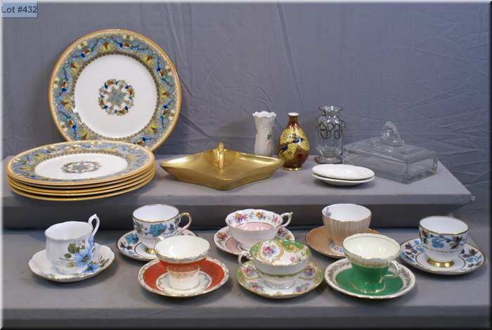 A selection of vintage teacups including Copeland, Royal Grafton, Paragon etc. plus small Carletonware vase, glass lidded cigarette box, plates etc.
