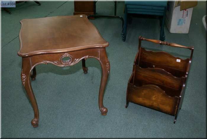 A semi-contemporary end table with Victorian influenced supports and a walnut magazine rack