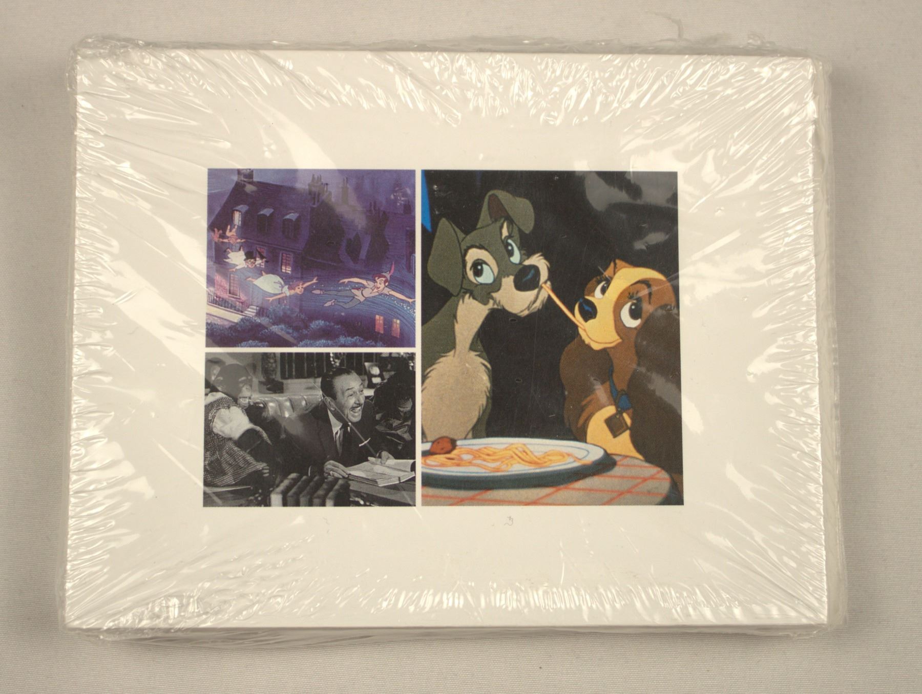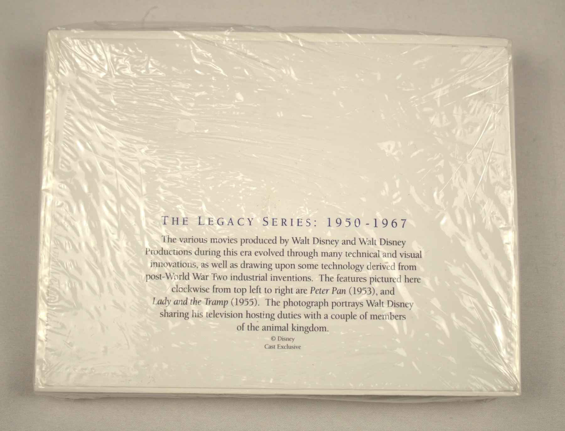 These Cast Exclusive note cards Have images of iconic scenes from the animated films Peter Pan and Lady and the Tramp, in addition to a shot of Walt Disney doing a television show with a couple of monkeys. The back of the notecard identify them as being part of the Legacy Series : 1950 - 1967. These cards are sealed and in new condition.