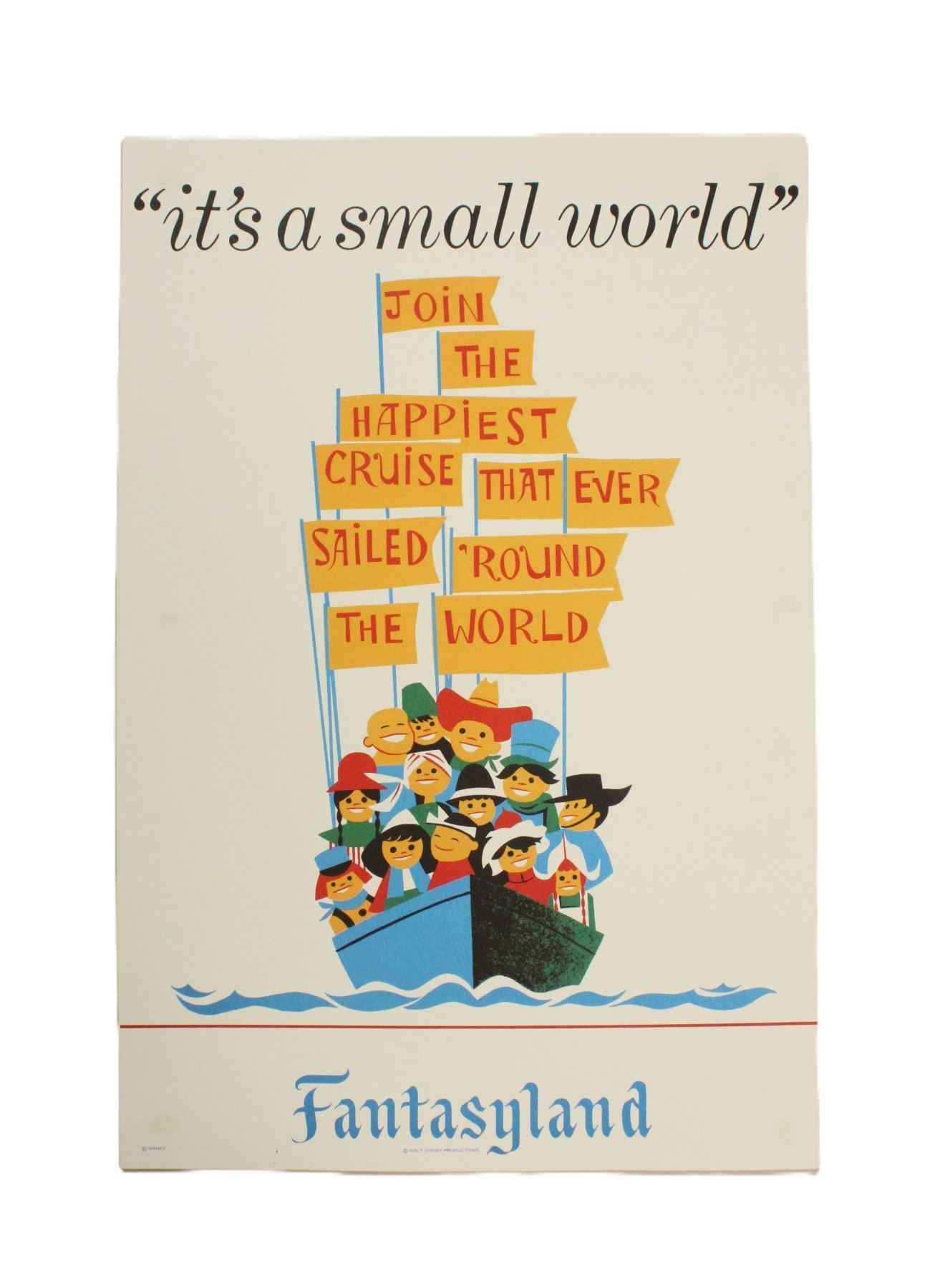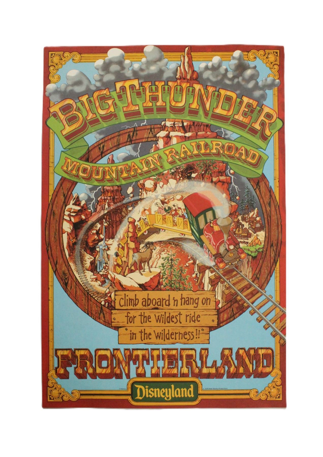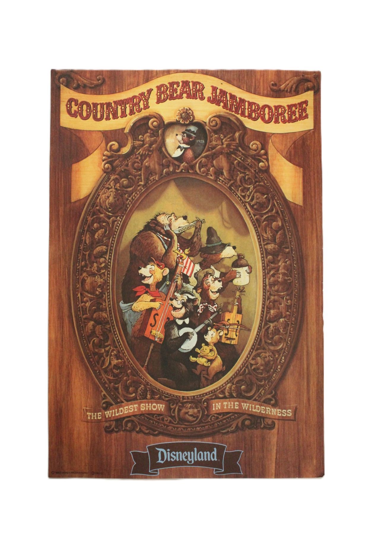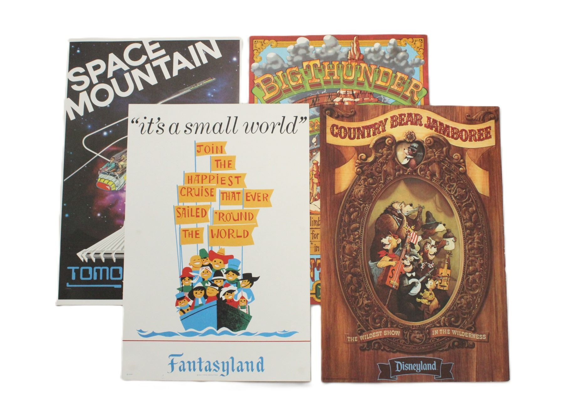 (Disney, 2000s) A collection of four mini Disneyland attraction posters. This lot includes posters for Country Bear Jamboree, It's a Small World, Space Mountain, and the Big Thunder Moutain Railroad. Measuring 12~"x 18~" the posters are in good to very good condition with light wear, scratches, and a small stains on the It;s a Small World poster.