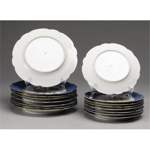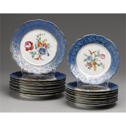 <B>A Set of Continental Porcelain Plates<BR></B></I> A set of Continental porcelain plates, comprised of eight salad plates and eight dinner plates. All with flower sprigs and blue border. Painter's mark to base.<BR> <B>Condition Report:</B> Chip to underneath side of rim of one salad plate, crack to one salad plate, chip and crack to one dinner plate, sticker residue to one dinner plate, areas of wear to paint<BR><BR><b>Shipping:</b> Hollowware/Pottery/Glass, Small (<a target="_blank" href="http://www.heritageauctions.com/common/shipping.php">view shipping information</a>)