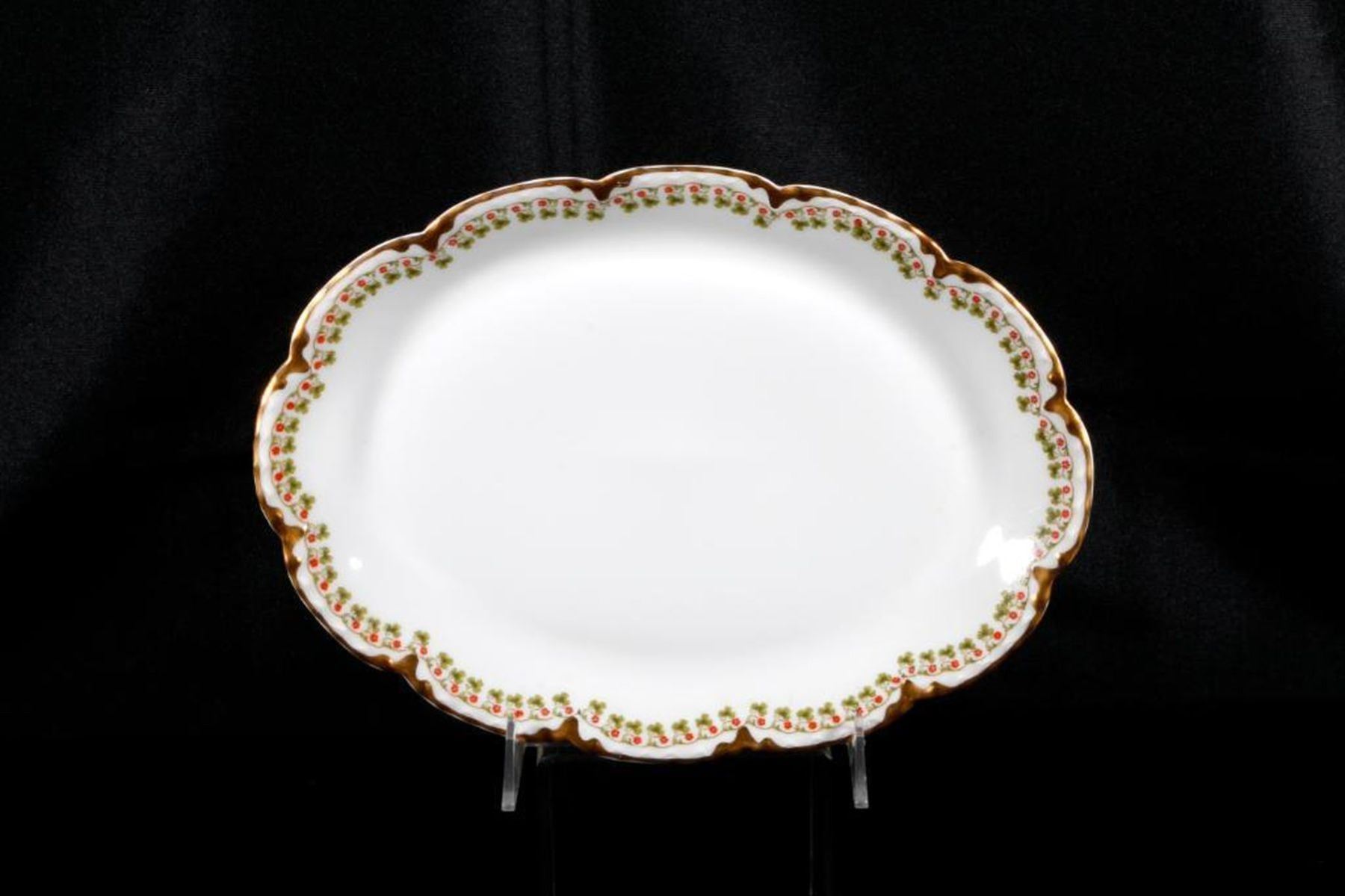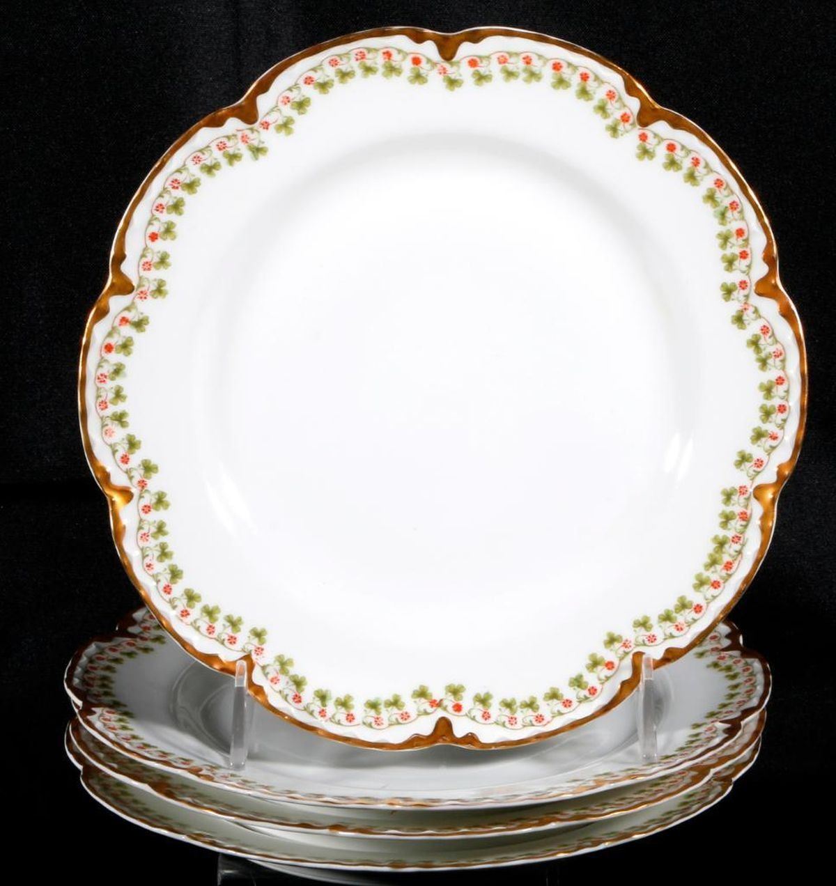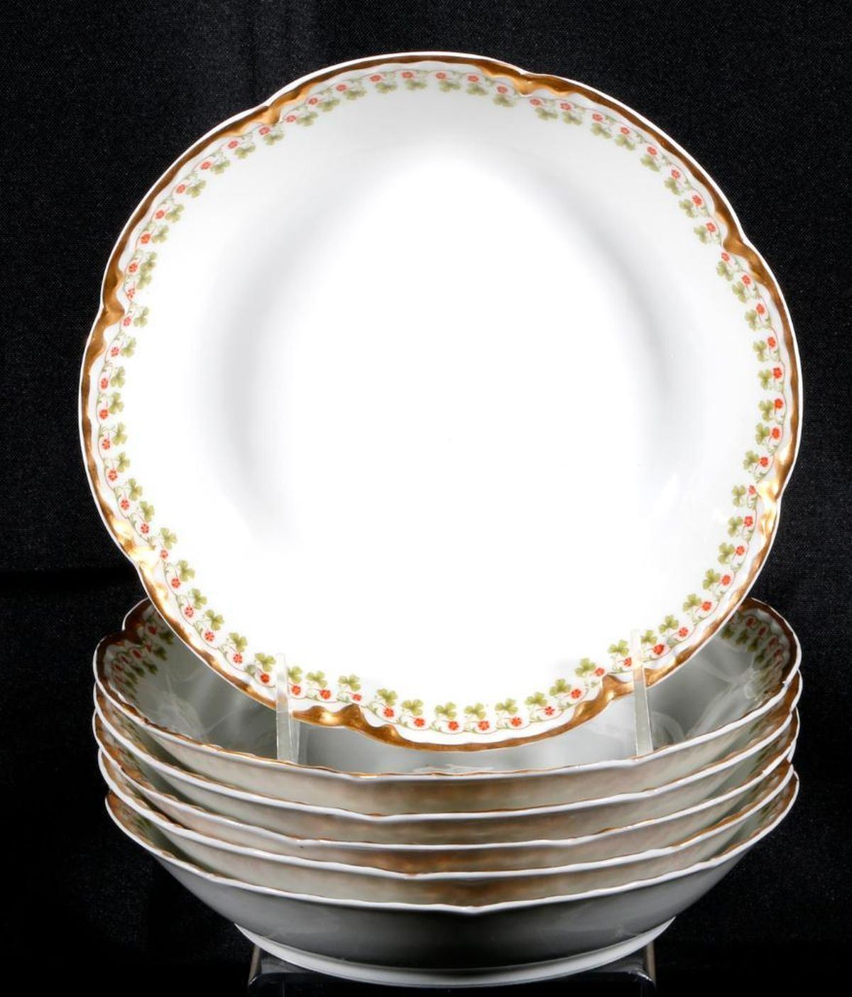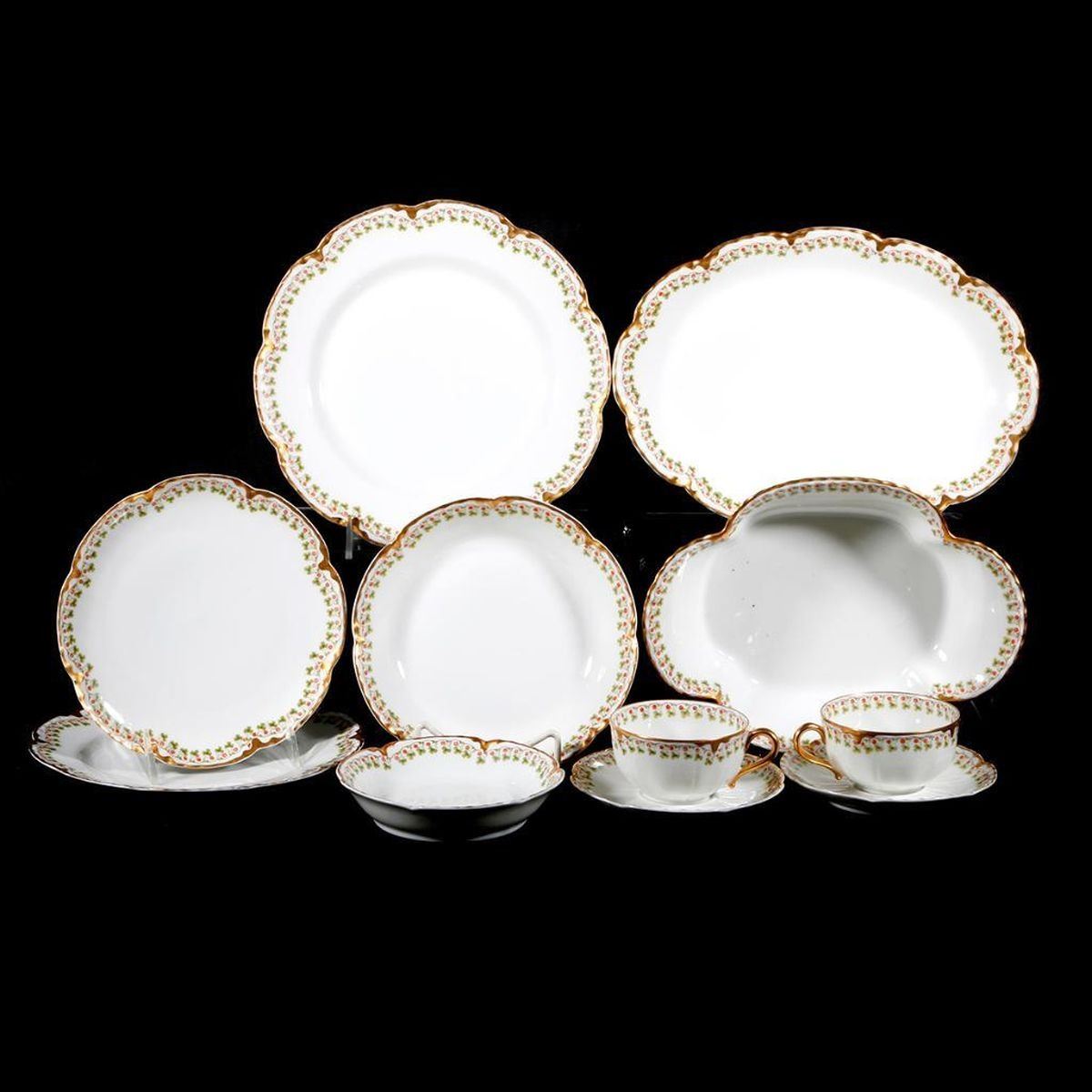 A 66 pieces dining set of vintage French Haviland porcelain consisting of 13 dinner plates (one chipped), 12 salad plates (2 chipped), 6 soup bowls and 6 base plates, 6 finger bowls and 6 base plates 6 teacups and 6 saucers, and five serving pieces.