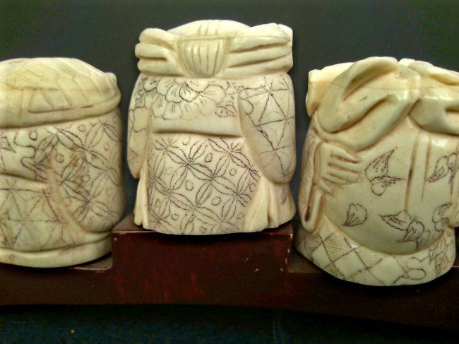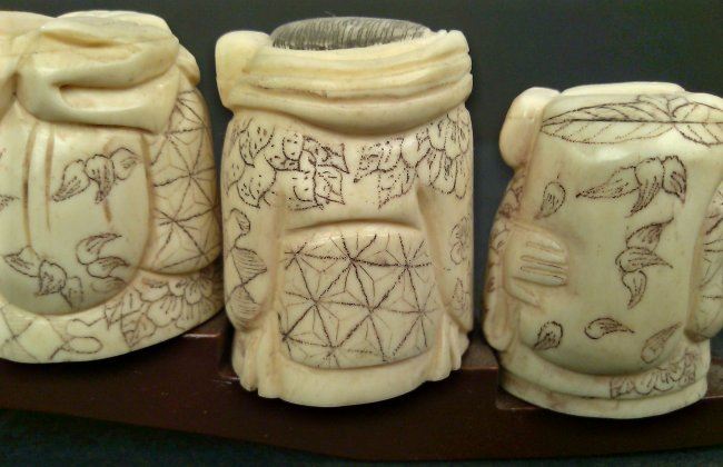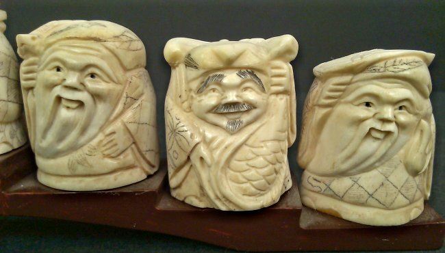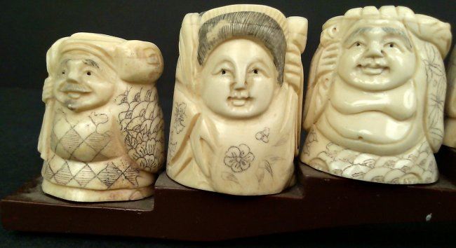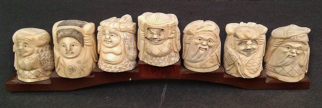A set of carved bone figurines of the seven fairies on a custom mahogany stand, their adorable little bodies hand painted in black ink. 12"L x 3"H