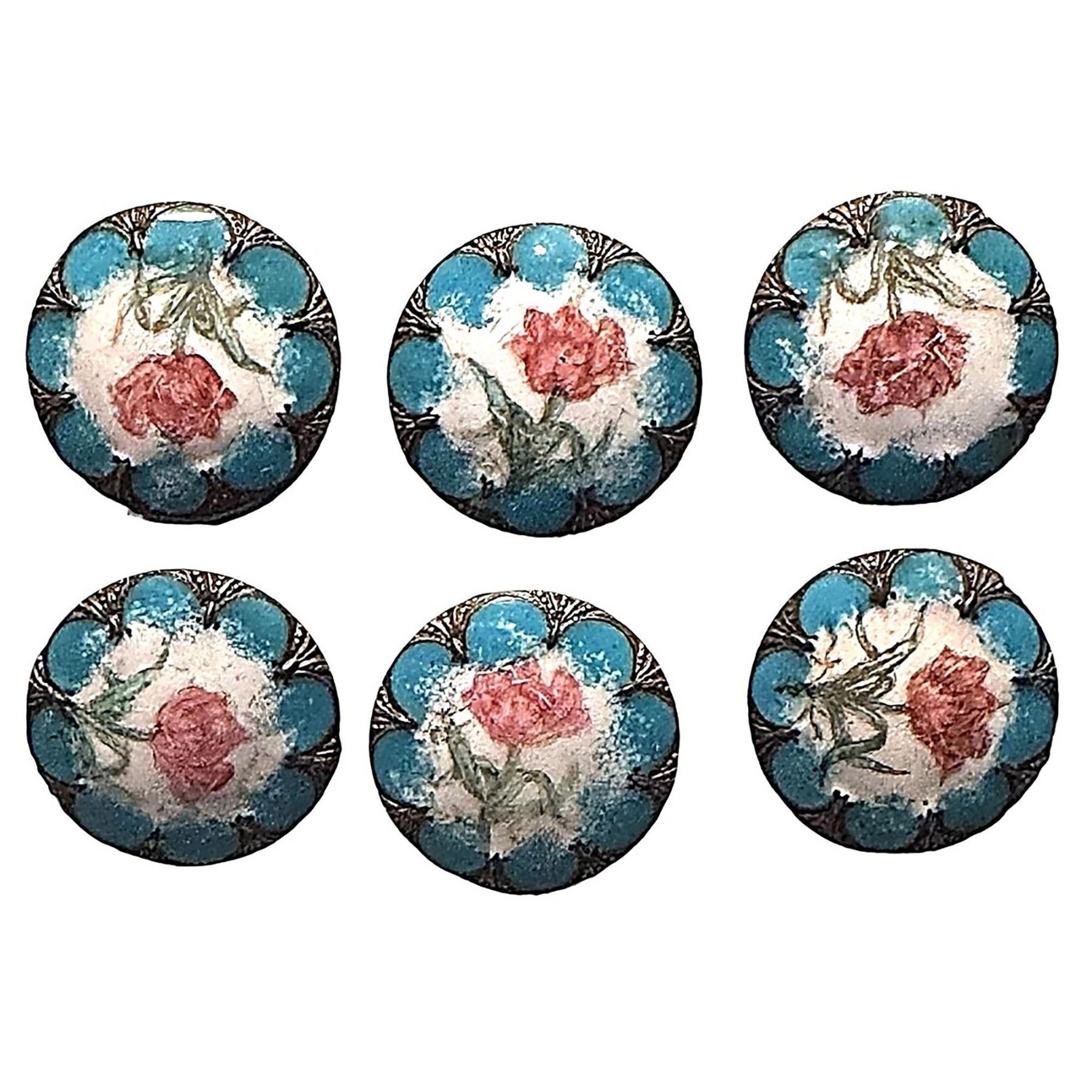 6 Medium early 20th century pictorial enamels. Sets are often asked for in our auctions and Jose Roman had several sets we have placed in this auction including these 6 floral designed enamel buttons.