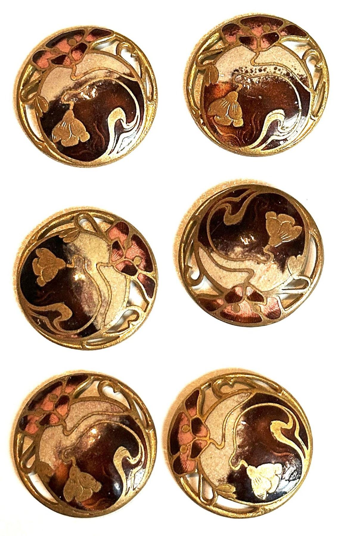 6 medium 19th century Art Nouveau Basse Taille examples. Here are 6 matching and striking enamel buttons in the Basse Taille technique and depicting flowing Art Nouveau florals. Beautiful set.