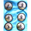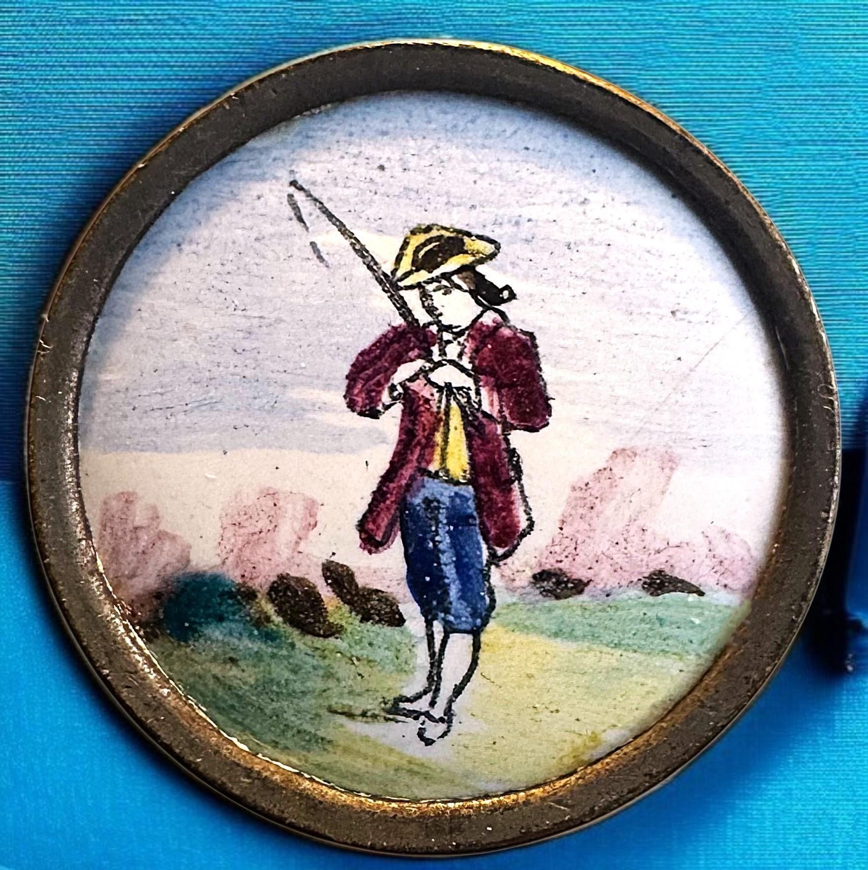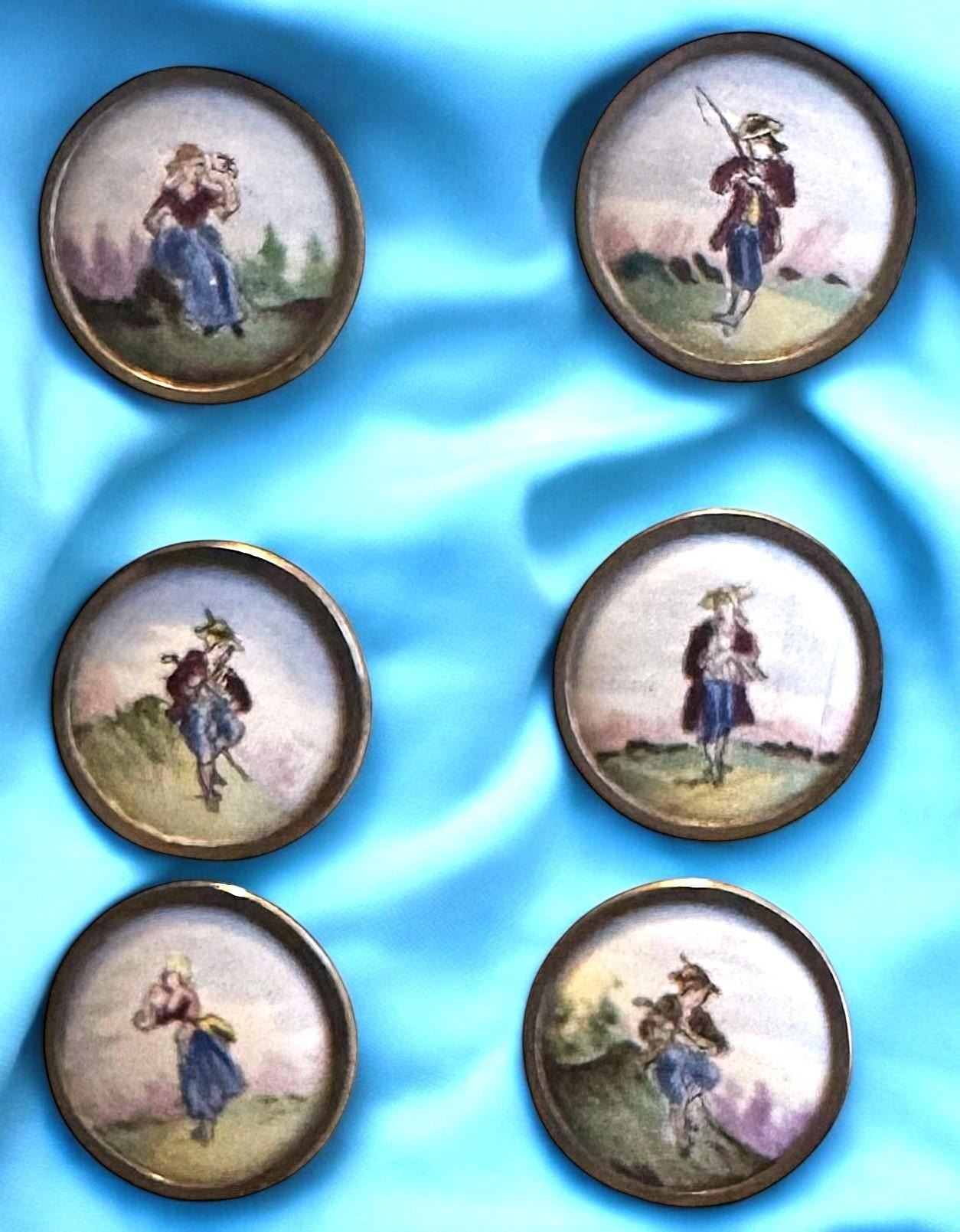 6 Medium size 19th century polychrome examples. It is not every day that one finds a set of buttons like this with 6 different pictorial scenes with figures of women and men on them all in colorful polychrome enamel and mounted into a quality setting.
