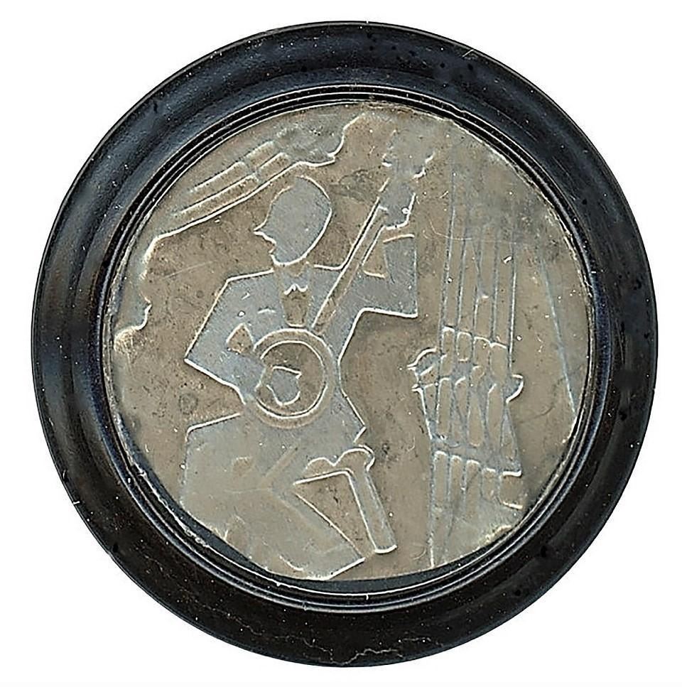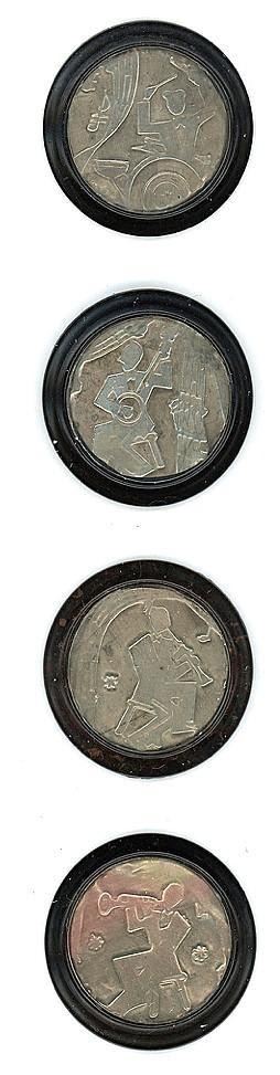 Here is a great set of Musicians and instruments, each one different. These are backmarked from England and are set with a clear shield over the central design. Great set and not always easy to find in the set! These are the large size examples.