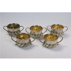 A set of five Victorian silver miniature porringers by Mappin & Webb, London 1898, each of waisted circular form, the lower bodies wrythen fluted, 4cm diameter, 4oz £100-150