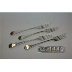 A set of four George III silver Old English pattern table forks by Hester Bateman, London 1790, cre.