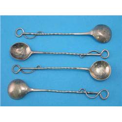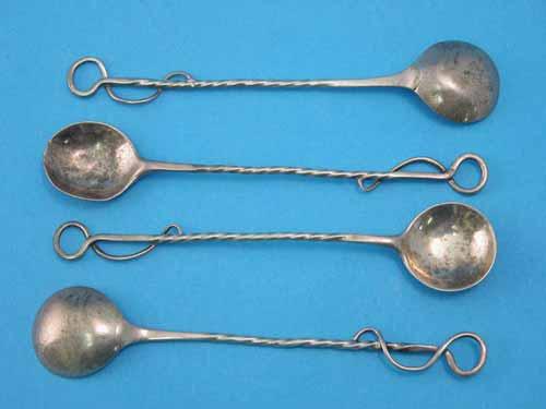 A set of four Georgian silver whip handle salt spoons, with spiral fluted shafts, unmarked...