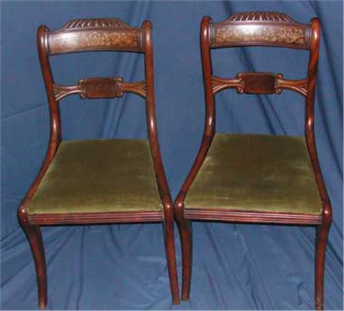 A set of four Regency mahogany and inlaid rosewood bar back dining chairs on sabre supports