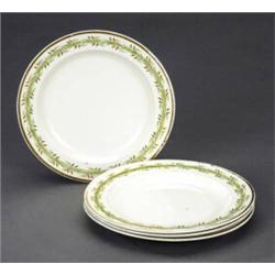 A set of four Wedgwood creamware plates, the border painted with band of leaves in green and gilt, 7.75in diam, impressed Wedgwood