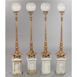 A set of four bronzed cast iron LANTERNS, on bases with "faux marbre" painting, glass shades, 228 cm high with bases; painting on bases later, later shades PROVENANCE: As a gift to the Catholic community in Stockholm from the crownprince Oscar (future king Oscar I, 1844-59) and the crownprincess Josephine of Leuchtenberg, daughter of Eugène de Beauharnais. The princess was a member of the Catholic community in Stockholm.