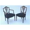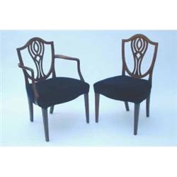A set of nine George III mahogany dining chairs in the Hepplewhite manner, each having shield-back with pierced splat and stuffover seat covered in blue dralon, on tapered square legs (two having arms) £2,000-3,000