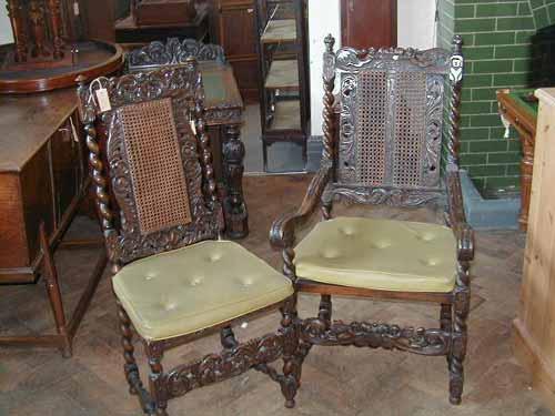 A set of six carved beech Carolean style dining chairs and a pair of similar armchairs £300-400