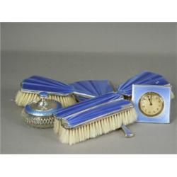 A seven piece silver and enamel dressing table set (with damage), clock 7cm high, 1929 Est. 140/1...