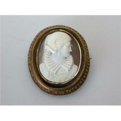 A shell cameo carved with an Elizabethan woman in profile, oval, contained in a cannetille decorate.