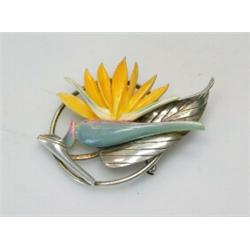 A silver and ivory brooch, the circlet back applied with a silver leafy branch and a bird of paradise in painted ivory, signed Mings of Honolulu, 60mm wide £70-100