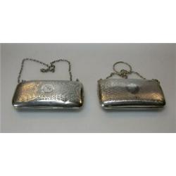 A silver evening purse, maker's mark indistinct, Chester 1916, of rectangular shape, engine turned, with suspension chain and finger ring, 9.5cm together with another similar purse by Horton and Allday, Birmingham 1916, initialled, 9.75cm (2) £100-150