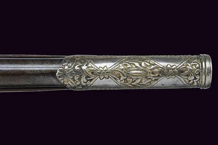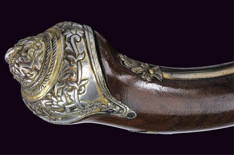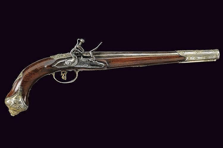 A silver mounted flintlock pistol Smooth, 15 mm cal. barrel, engraved and stamped; remains of engraving at the lock; wooden full stock with gilt silver mounts, decorated with bas-relieved floral motifs. _dimensions: length 50 cm. _provenance: Ottoman