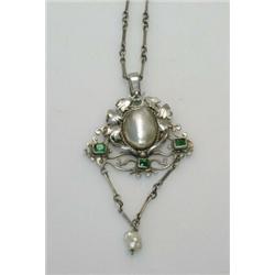A silver pendant with pearl centre within a wreath of leaves above three small emeralds, the drop with pearl terminal, 80mm, on a neck chain £200-300
