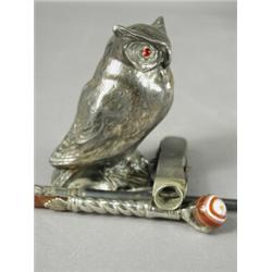 A silver penknife cigar cutter, an owl stamped to the reverse, a silver handled boot pull and a c...