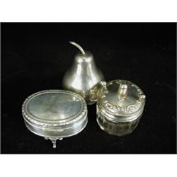 A silver string box of pear shape. 1909, 9cm high, a silver jewellery box. 1913 and a glass table...