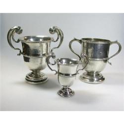 A silver two handled trophy cup, maker F&B, Glasgow 1921, raised on a circular foot the plain body with moulded girdle below two scroll handles, 11.25cm, inscribed to Lloyds Register (Scottish Staff) Golf Club; another two handled trophy cup by Walker & Hall, Chester 1906, with two flying scroll handles, 15cm, inscribed and another small trophy cup, 19oz (3) £70-100