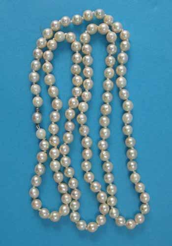 A single row necklace, of uniform cultured pearls with pearl clasp, 38ins £150-200