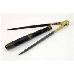 A small 19th century lacquered brass telescope, three drawer with leather grip and cover, the eye piece marked ‘SBR’, together with a late 18th century brass mounted navigational compass, marked ‘BHS’, 11 ins longest £100-150