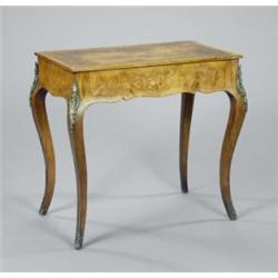 A small Victorian walnut writing table, the rectangular top with inset stamped leather writing surface, the flared apron inlaid with boxwood leafy arabesques, the angular cabriole legs with brass foliate mounts, 73 x 43cm, c.1860 (faults) 150/250