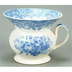 A small blue-printed spittoon, of spherical shape with typical wide conical rim and simple moulded strap handle, printed in light blue with sprays of fruit and flowers and a border of fruiting vines, diameter 12.9cm, unmarked, circa 1835-50 (restored chip to foot, crack across base of handle)