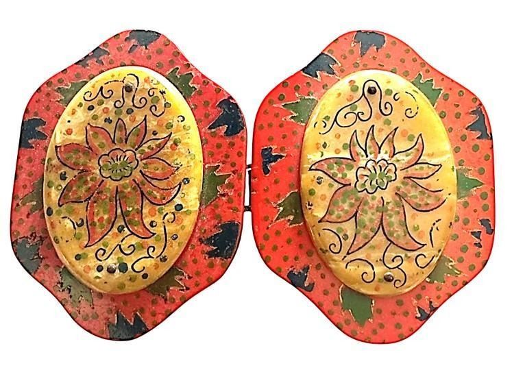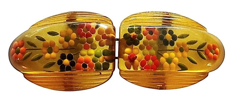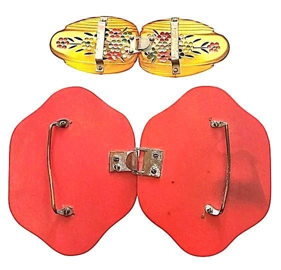 2 Large 20th century 2 piece buckle including Casein. Here we have one very large 2 piece red Casein with a hand painted design on top along with a 2 piece applejuice Bakelite buckle with reverse carving and paint.